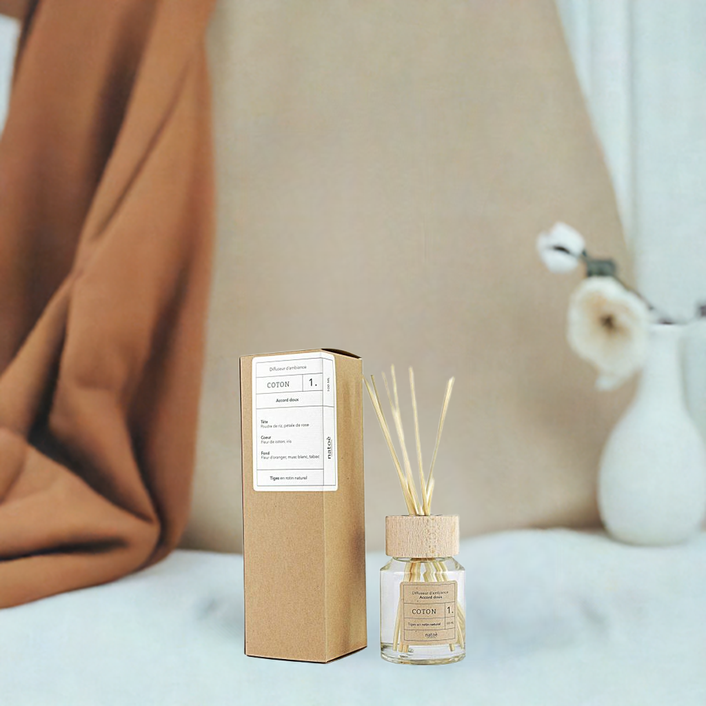 Indoor Diffuser in wood & glass, color "natural" 100ml. +rattam stem. Made in France.
